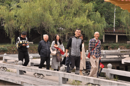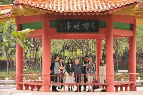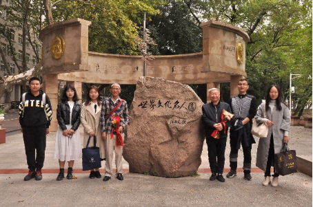 座谈会之后,趁着秋高气爽,老教师们在部分师生的陪同下,边走边谈,欣赏校园秋景。到达世界文化名人园,看到涂又光先生的题字,老教师们从涂先生的求学过程和学术研究上给我们讲述了其传奇经历。在醉晚亭,一同看岸边树影行人、湖面水色丛花,体会“耳得之而为声,目遇之而成色”,感悟“造物者之无尽藏也”。